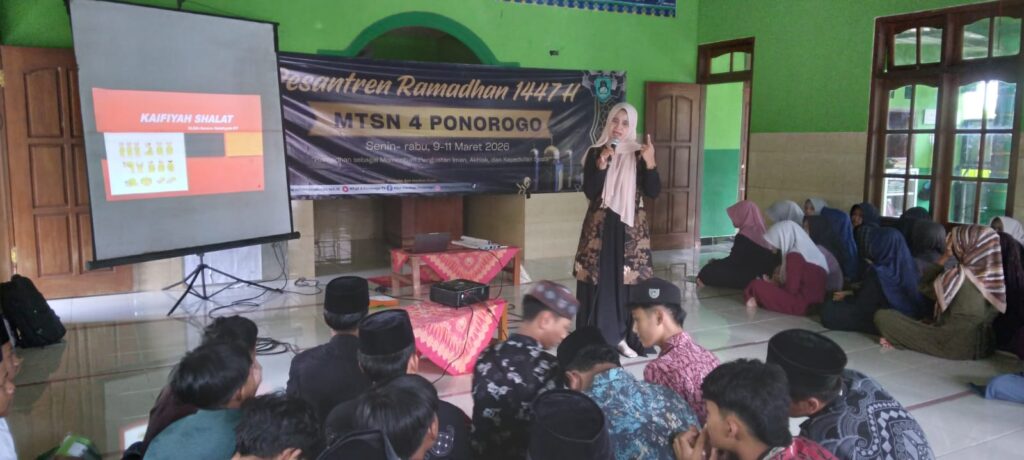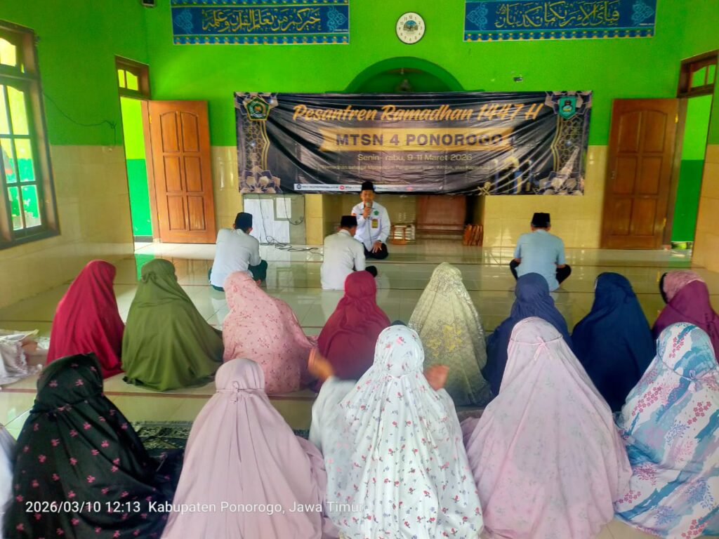 Ponorogo – MTsN 4 Ponorogo menggelar kegiatan Pesantren Ramadan 1447 H pada 9–11 Maret 2026 dengan konsep bermukim di lingkungan madrasah. Kegiatan ini diikuti oleh seluruh siswa yang hadir dengan mengenakan busana muslim, menciptakan suasana religius yang khidmat, penuh semangat, dan terasa hangat dalam nuansa kekeluargaan.
